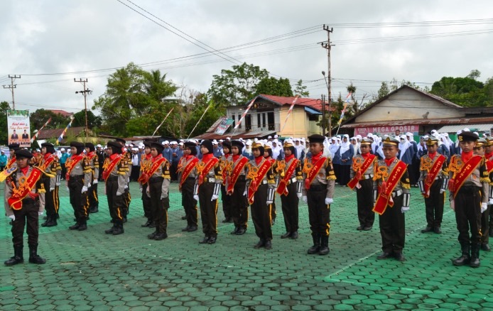 Puluhan anak-anak Madrasah Ibtidaiyah ini sangat kompak menampilkan atraksi kesamaptaan dan yel-yel pasukan.