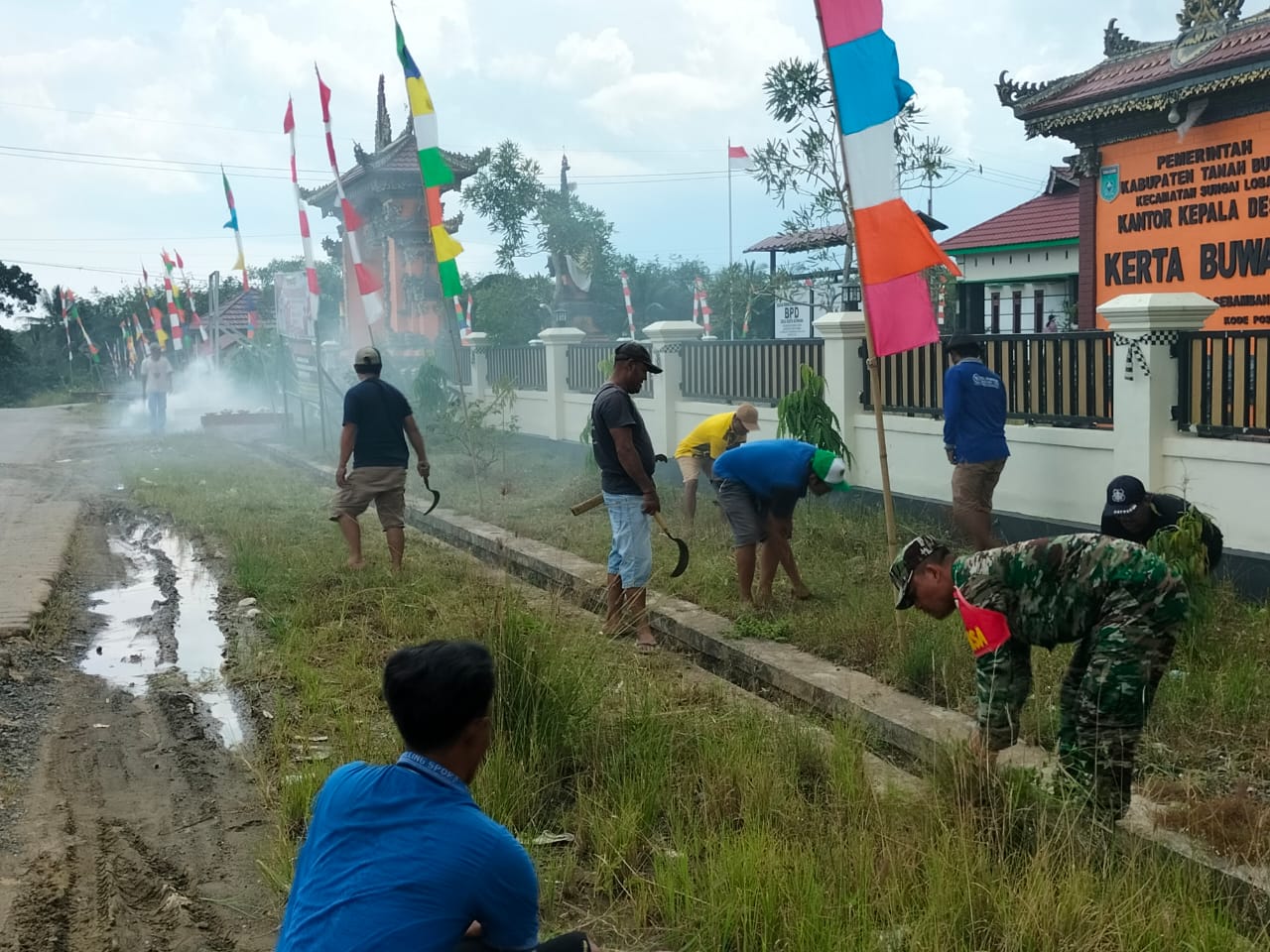 Gotong royong membersihkan rumput liar dan sampah yang berserakan disekitar kantor desa, guna persiapan HUT ke-41 Desa Kerta Buana, selain dibersihkan juga dipasang umbul-umbul untuk menandai adanya kegiatan acara.