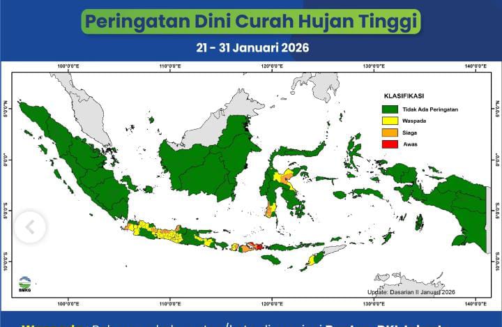 BANDUNG — Badan Meteorologi, Klimatologi, dan Geofisika (BMKG) Jawa Barat mengingatkan masyarakat untuk meningkatkan kewaspadaan terhadap potensi hujan dengan intensitas sedang hingga ekstrem dalam sepekan ke depan, terhitung 23–29 Januari 2026.