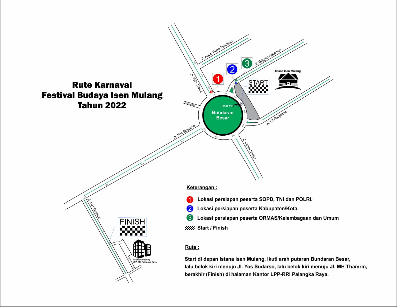 Start Karnaval tepat di depan Istana Isen Mulang, selanjutnya peserta Karnaval meikuti arah putaran Bundaran Besar, lalu belok kiri menuju Jalan Yos Sudarso lalu belok kiri menuju Jalan MH Thamrin, dan berakhir (Finish) di halaman Kantor LPP-RRI Palangka Raya.