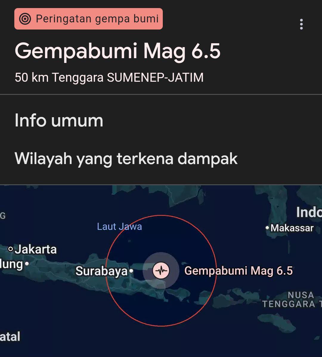 SUMENEP – Gempa bumi berkekuatan magnitudo (M) 6,5 mengguncang wilayah Sumenep, Jawa Timur, pada Senin malam (30/9/2025). Guncangan kuat yang terjadi pukul 23.49 WIB itu memicu kepanikan warga karena getarannya terasa hingga Malang, Surabaya, Bali, dan sejumlah kota lain di Jawa Timur.
