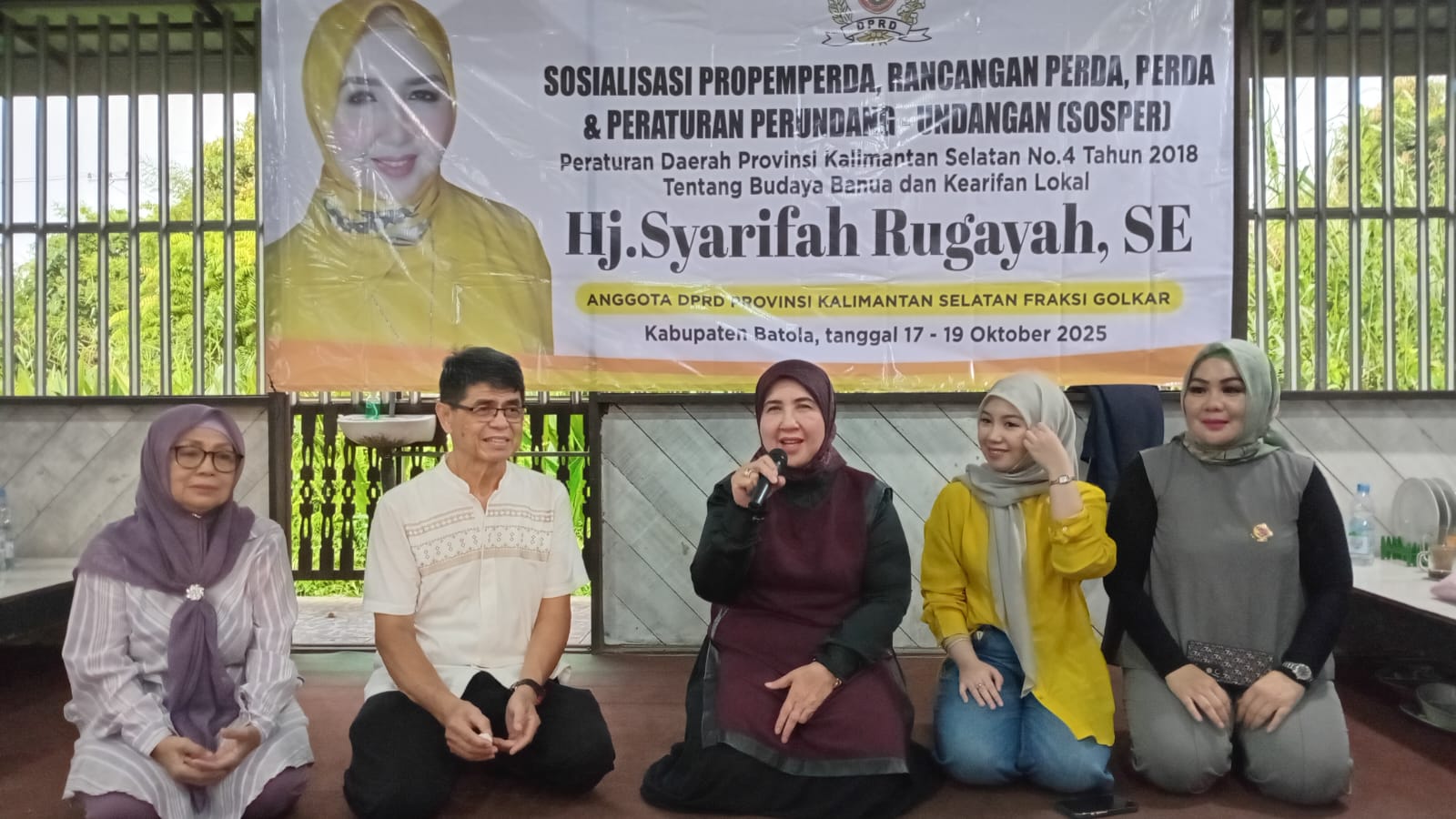 Barito Kuala — Anggota DPRD Provinsi Kalimantan Selatan Fraksi Golkar, Hj. Syarifah Rugayah, SE, mendorong penguatan pelestarian budaya Banua dan kearifan lokal melalui kegiatan Sosialisasi Program Pembentukan Peraturan Daerah (Propeperda), Rancangan Peraturan Daerah (Raperda), serta Sosialisasi Peraturan Daerah dan Peraturan Perundang-undangan (Sosper) di Depot Class Kakap, Jalan Trans Kalimantan, Handil Bakti, Kabupaten Barito Kuala, pada 17–19 Oktober 2025.