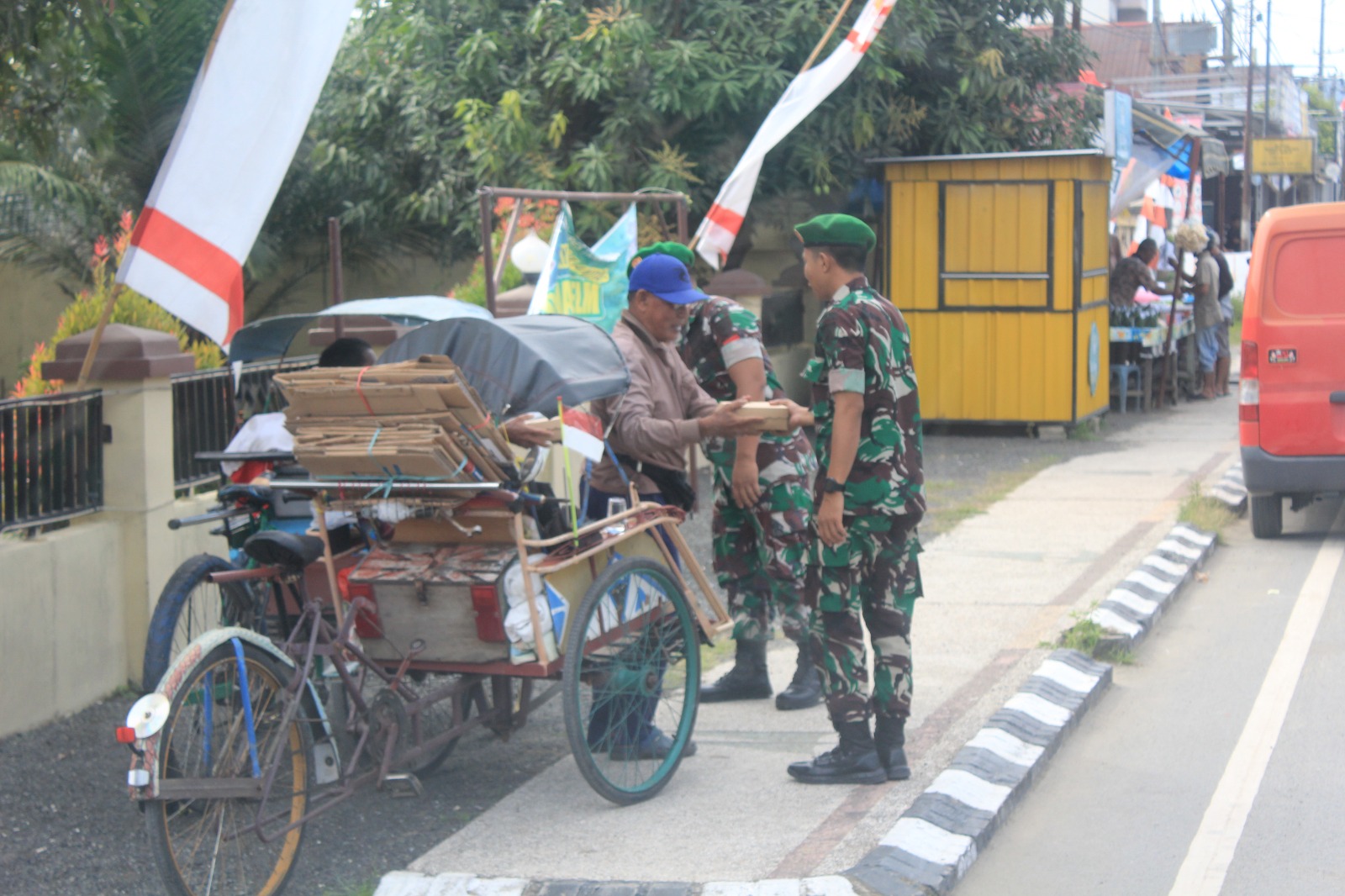 Personel Kodim 1022/Tanah Bumbu saat menyalurkan nasi bungkus kepada tukang becak.