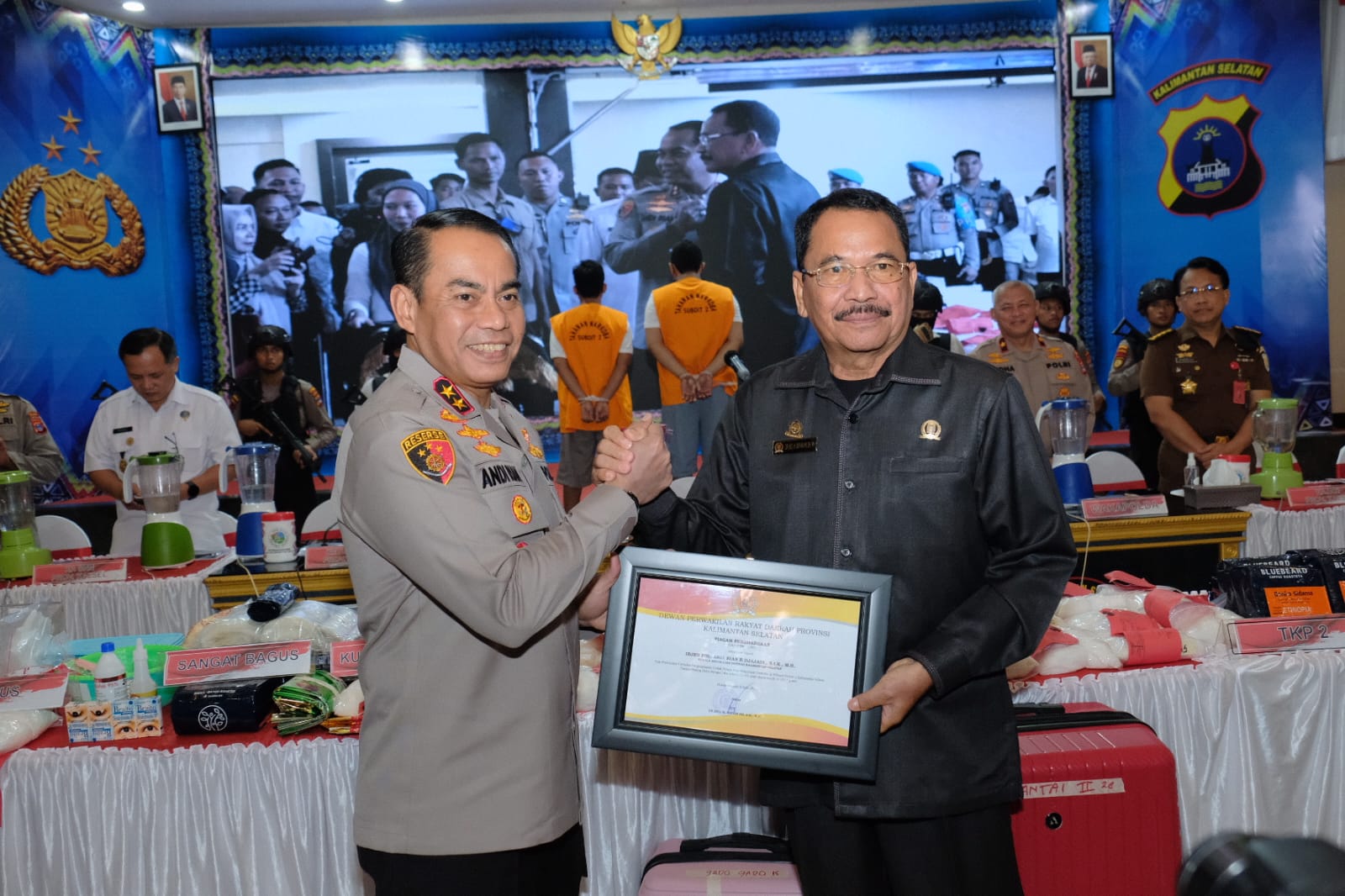 BANJARMASIN – Kapolda Kalsel Irjen Pol Andi Rian Djajadi, S.I.K., M.H., dan Dir Resnarkoba Polda Kalsel Kombes Pol Tri Wahyudi, S.I.K., M.H. menerima penghargaan dari Gubernur dan Ketua DPRD Kalsel berlangsung di Aula Bhayangkari Mathilda Batlayeri Polda Kalsel. Rabu (14/6/2023).