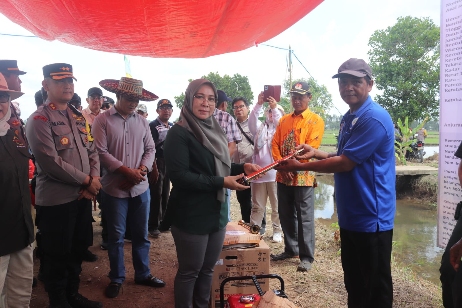 Pj Bupati Pulang Pisau Hj Nunu Andriani didampingi Kepala Dinas Tanaman Pangan, Hortikultura dan Peternakan Provinsi Kalimantan Tengah meninjau langsung lokasi pengembangan padi varietas Inpari IR Nutri Zinc yang di berada di 5 desa yaitu Desa Sanggang, Desa Pantik, Desa Belanti Siam, Desa Gadabung, Desa Karya Bersama. Sabtu (23/12/2023).
