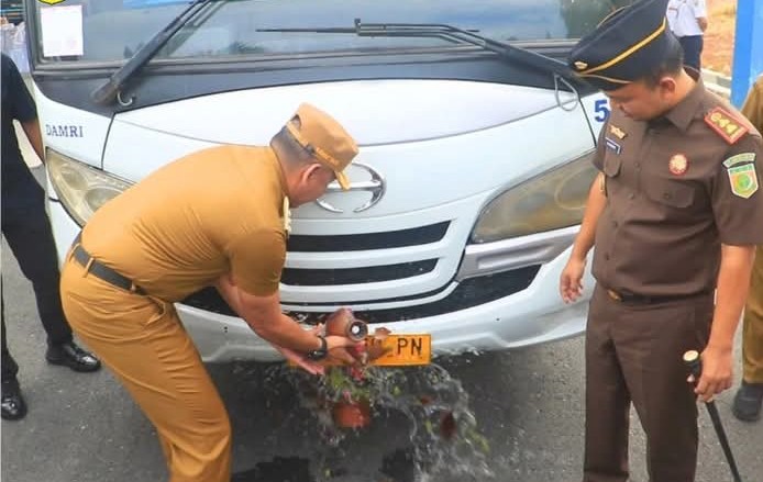 Pemecahan kendi sekaligus pengibaran bendera oleh Bupati Tala, H. Rahmat Trianto menandai resminya rerouting untuk tiga unit armada angkutan perintis Damri di terminal bertipe C tersebut.