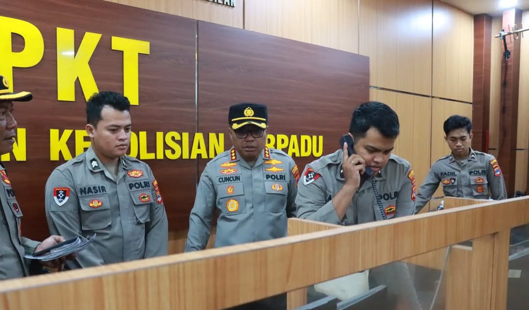 Kapolresta Banjarmasin, Kombes Pol. Cuncun Kurniadi, S.I.K., M.H. saat memantau layanan hotline 110 Polri di Ruang SPKT Polresta Banjarmasin, Minggu (16/3) Foto dok. Humas Polresta Banjarmasin