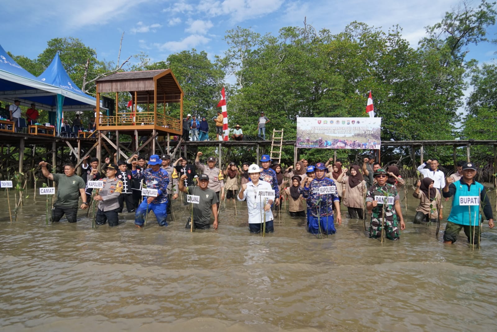 BATULICIN – Guna menjaga kelestarian dan ekosistem alam di kawasan Bumi Bersujud, Kodim 1022/Tanah Bumbu menanam 1000 pohon mangrove di Kersik Putih, Batulicin. Rabu (21/2/2024).