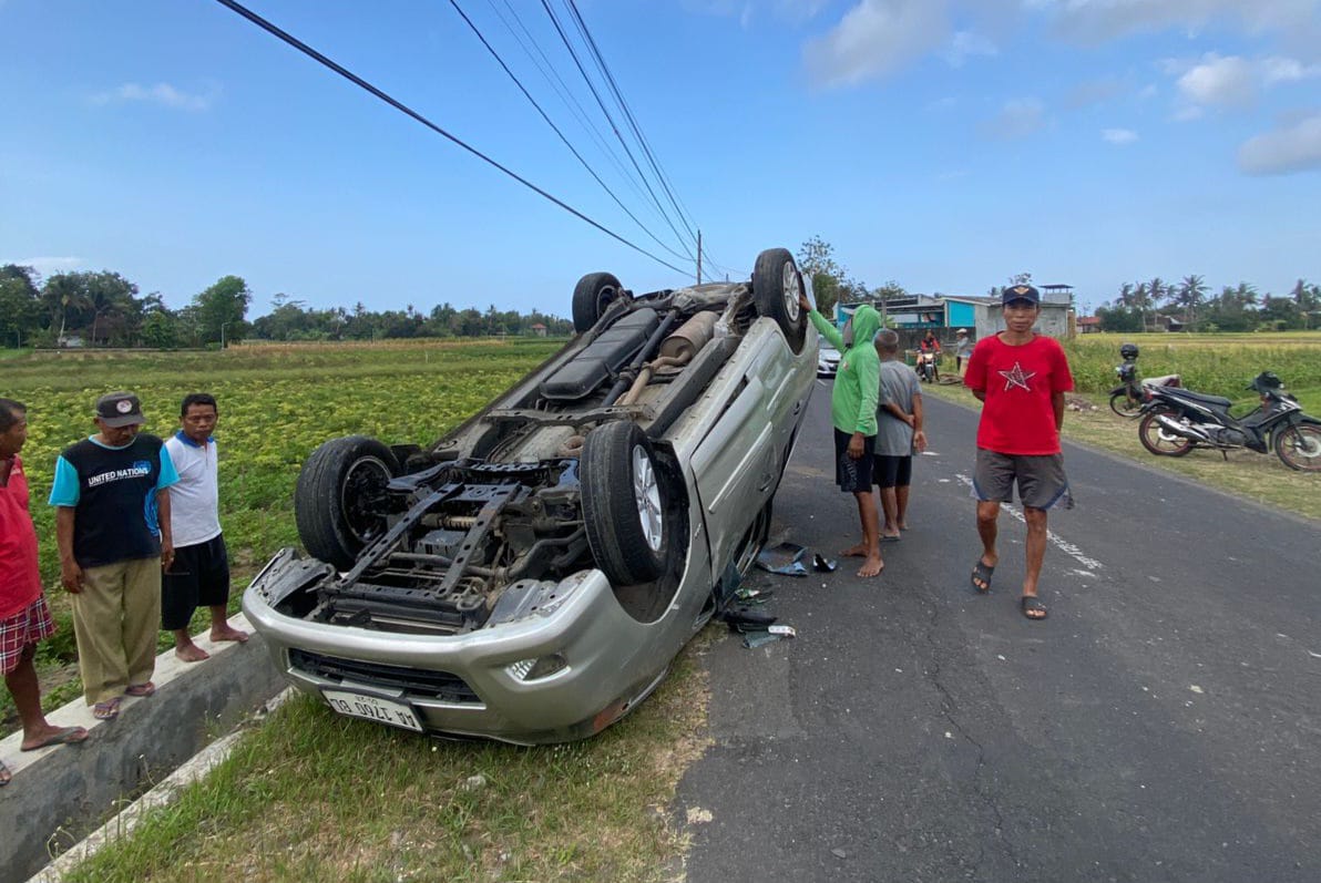 SEBUH mobil terbalik di jalan lapangan Mojo-Jemer, Gadingdaton, Donotirto, Kretek, Kabupaten Bantul, provinsi Daerah Istimewa Yogyakarta (DIY).