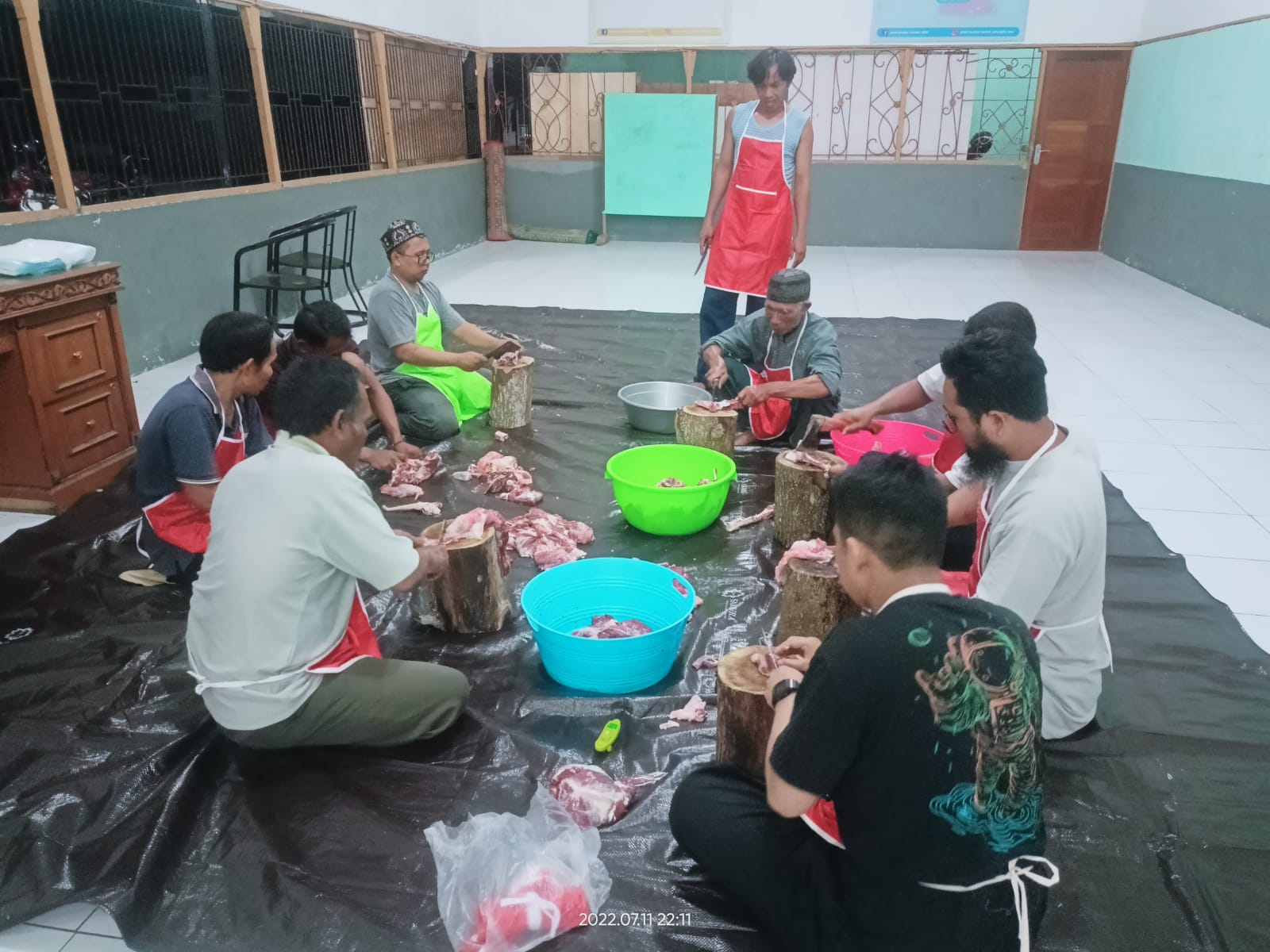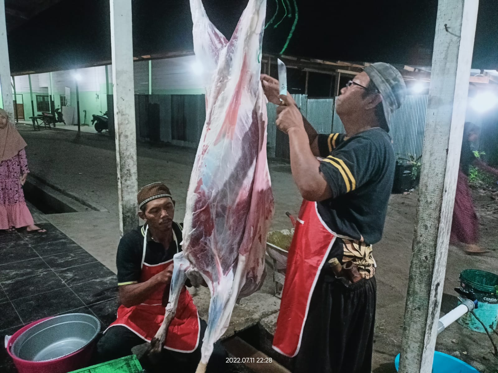 Dari enam ekor kambing yang kami potong satu ekor kambing untuk acara Aqiqah. Pemotongan hewan kurban sebanyak 7 ekor ini kami lakukan pada Senin, 11 Juli 2022 malam.