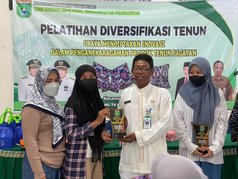 Bacakabar.id, BATULICIN – Kepala Dinas Koperasi Usaha Mikro Perdagangan dan Perindustrian (DKUMP2) Kabupaten Tanah Bumbu, Denny Hariyanto melalui Sekretaris DKUMP2 Ahmad Syarwani menutup secara resmi pelatihan diversifikasi tenun Pagatan, Jumat (18/11/2022) di Aula Kantor Lurah Kota Pagatan, Kecamatan Kusan Hilir.