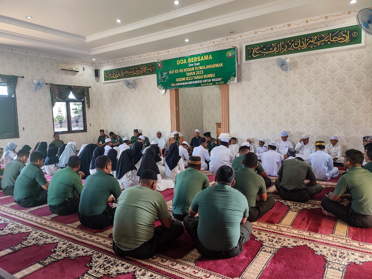 Tanah Bumbu – Dalam rangka memperingati Hari Ulang Tahun Kodam VI/Mulawarman ke-65, Kodim 1022/Tnb menggelar Doa Bersama dengan mengundang anak Yatim Piatu Panti Asuhan yang dilaksanakan di Mushola Makodim 1022/Tnb, Senin (17/07/2023).