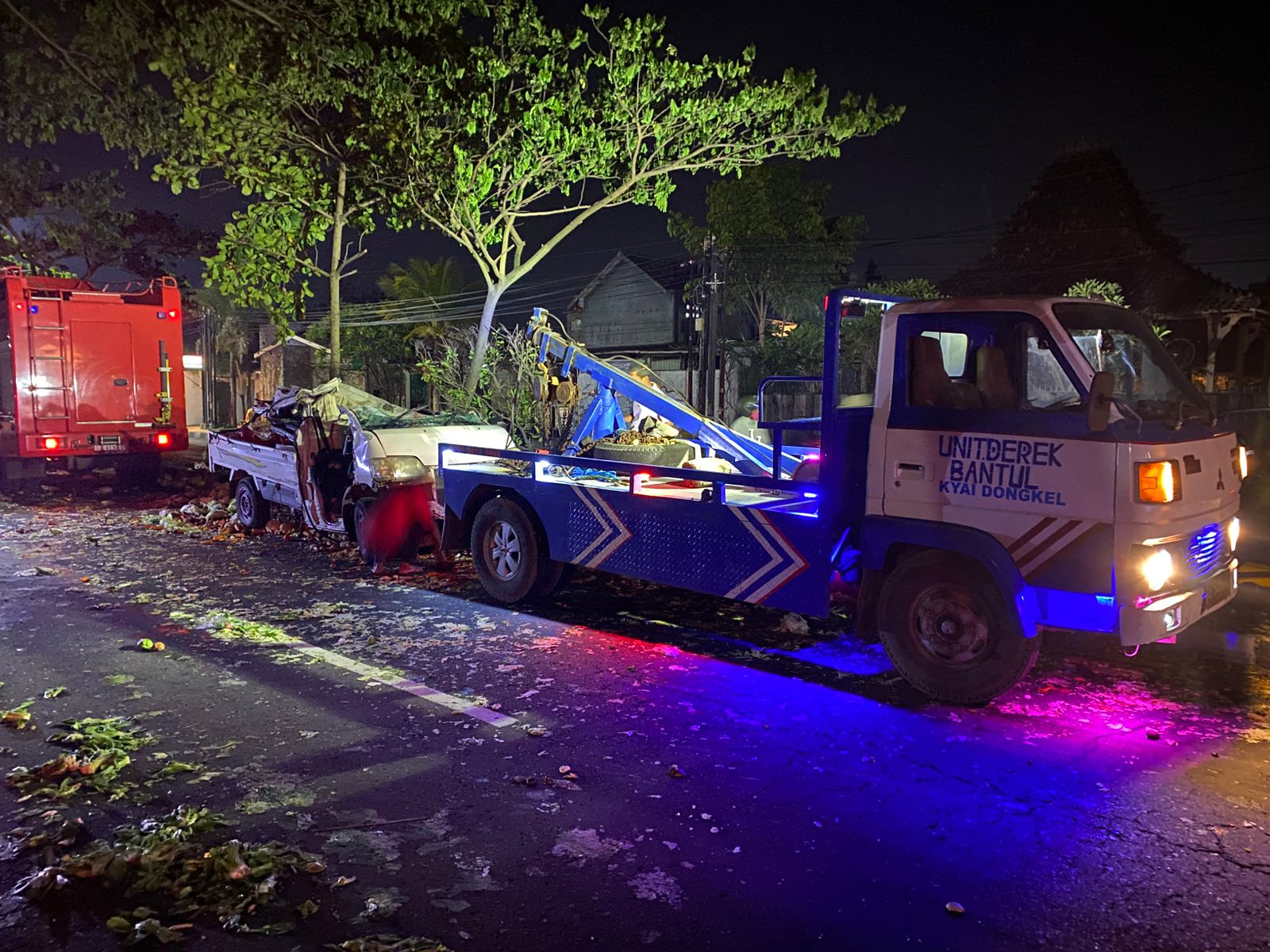Polisi saat mengevakuasi mobil bak terbuka yang rengsek usai menabrak pohon di Sewon, Bantul, Yogyakarta.