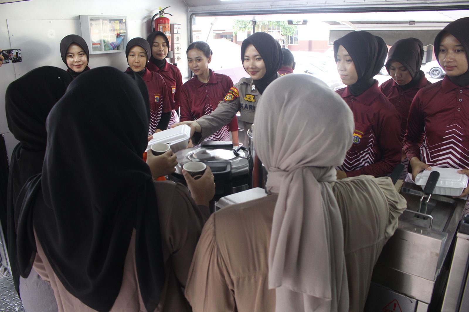 Dapur umum dioperasikan oleh personel Polwan. Setiap mahasiswa berhak mendapatkan makanan gratis cukup menunjukkan Kartu Tanda Mahasiswa (KTM) dan KTP asal provinsi terdampak. Jadwal layanan makan ditetapkan pukul 08.00 WIB, 12.00 WIB, dan 18.00 WIB.