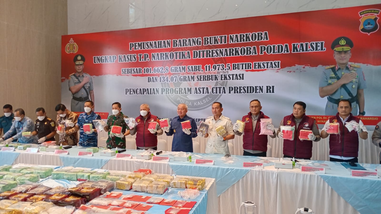 Barang bukti yang dimusnahkan meliputi 101.662,8 gram sabu, 11.973,5 butir ekstasi, dan 134,07 gram serbuk ekstasi. Proses pemusnahan dilakukan menggunakan blender dicampur cairan kimia hingga barang bukti benar-benar musnah dan tidak bisa disalahgunakan kembali.