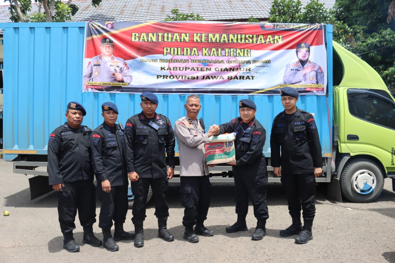 Dansatbrimob Polda Kalteng Kombes Pol. Suryo Sudarmadi, melalui Kasiops Satbrimob Kompol Richard, selaku Kepala Ti0m Bantuan Kemanusian Polda Kalteng menyerahkan bantuan korban gempa melalui Polres Cianjur.