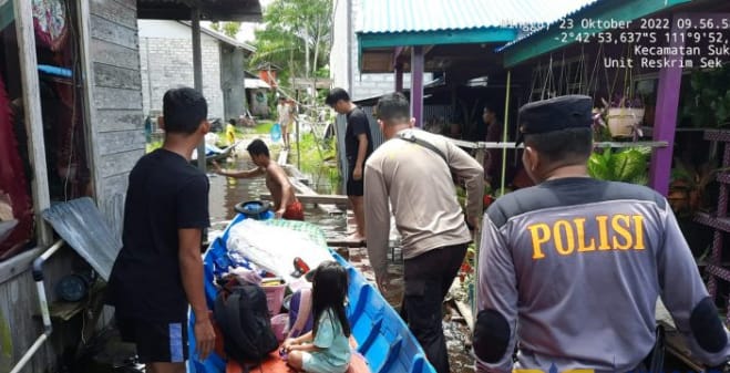 Personil Polres Sukamara tertangkap kamera saat mengevakuasi barang warga terdampak banjir di Padang dan Mendawai