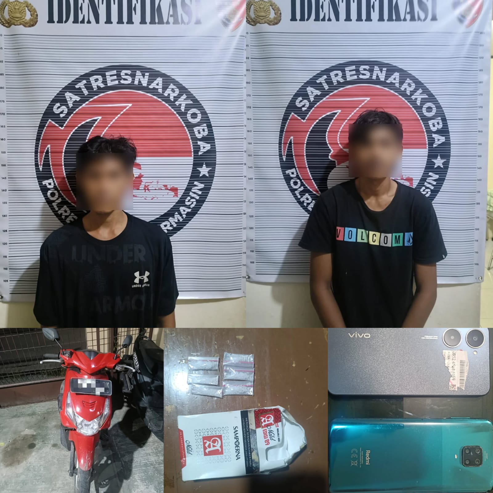 ndphone, 1 timbangan digital, 2 bundel plastik kosong, 1 sendok dari sedotan, 1 sepeda motor, dan Kotak rokok Sampoerna merah.