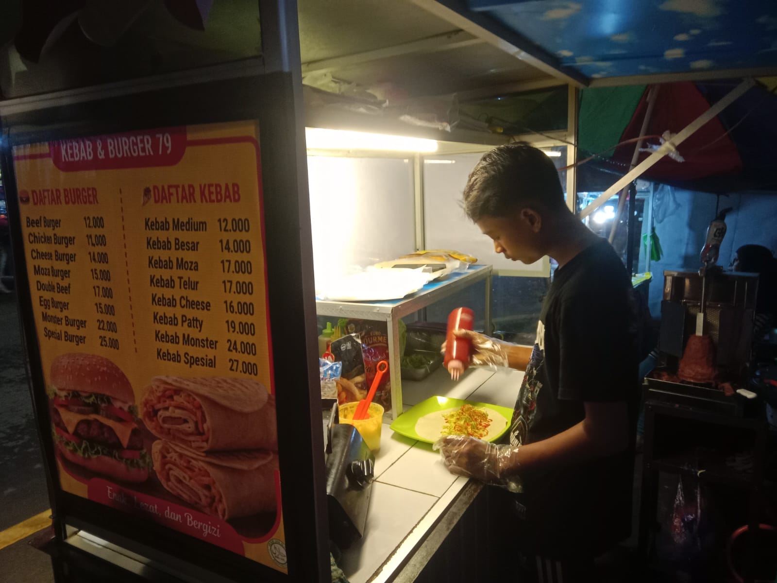 Seorang siswa SMP di Majalengka berjualan burger dan kebab di lapak kuliner sederhana pada sore hari.