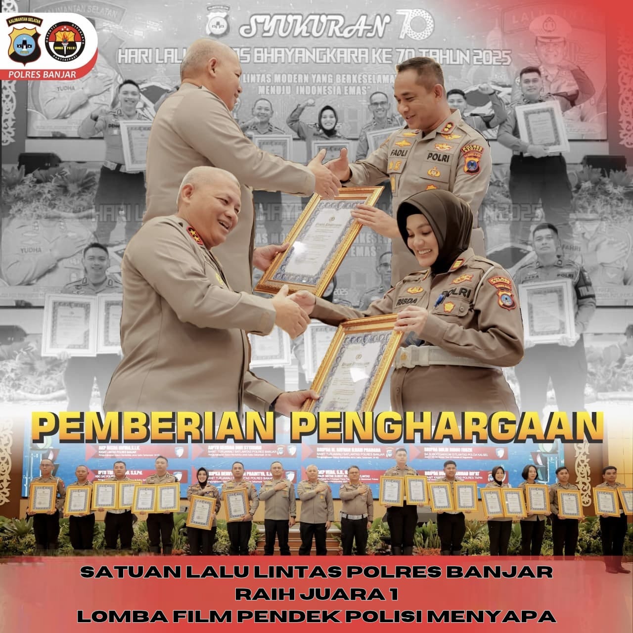 MARTAPURA – Prestasi membanggakan diraih jajaran Satuan Lalu Lintas (Satlantas) Polres Banjar. Pada momentum peringatan Hari Lalu Lintas Bhayangkara ke-70, mereka berhasil keluar sebagai pemenang Lomba Film Pendek Polisi Menyapa yang digelar Polda Kalimantan Selatan.