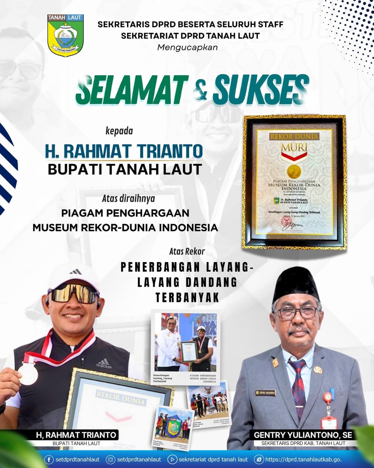 Tanah Laut – Sekretariat DPRD Kabupaten Tanah Laut bersama seluruh staf menyampaikan ucapan selamat dan sukses kepada Bupati Tanah Laut, H. Rahmat Trianto, yang berhasil meraih Piagam Penghargaan dari Museum Rekor Dunia Indonesia (MURI).