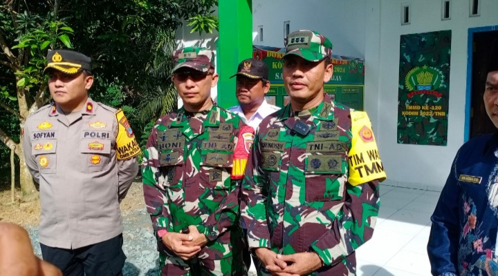 Paban V/Bakti TNI Sterad, Kolonel Inf Purnomosidi, didampingi Dandim 1022/TNB Letkol Inf Boni Berdian,.SE dan Wakapres Tanah Bumbu Kompol Sofyan, S.I.K saat di depan Pos Kotis TMMD ke 120 Desa Karang Rejo Rabu, (05/6/2024).