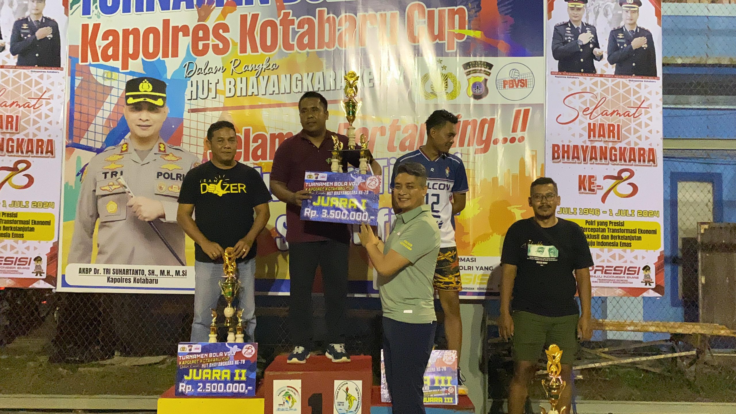Penutupan turnamen sekaligus penyerahan trofi dilakukan oleh Kapolres Kotabaru, AKBP Tri Suhartanto di lapangan Voli Outdoor Kotabaru, Jalan Veteran Desa Dirgahayu, Kecamatan Pulau Laut Utara, Kotabaru, pada Jumat, (14/6/2024) malam.